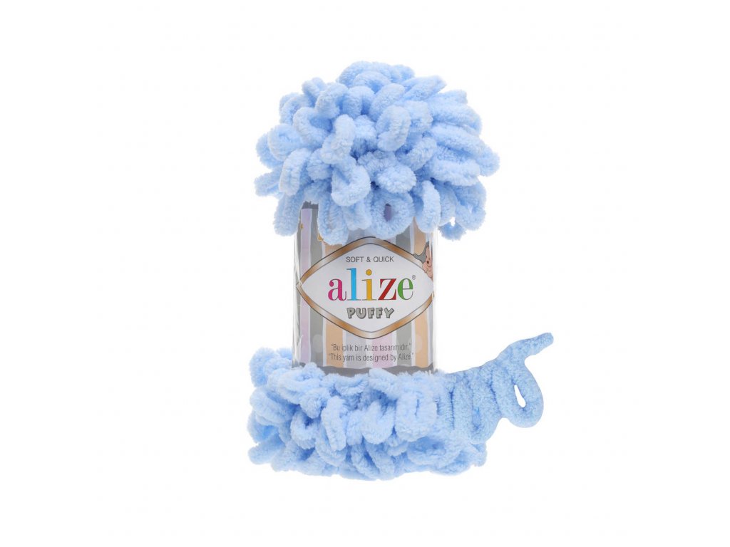 Příze Alize Puffy ve světlounce modré barvě ze 100% mikropolyesteru.