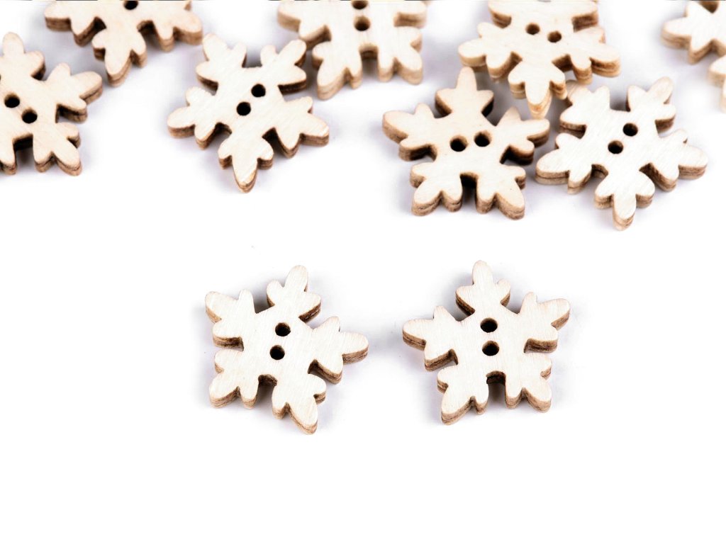 Dřevěný knoflíček ve tvaru vločky je působivým doplňkem zimních dekorací. Povrch je lakovaný, díky čemuž vynikne přirozená kresba dřeva a knoflík získává jemný lesk. Využijete jej při aranžování svátečního stolu, výrobě vánočních věnců, přáníček, dekorací nebo při technice scrapbooking. Skvěle se hodí i pro ozdobení dárkových balíčků, rámečků či přilepení na dřevěné kolíčky.