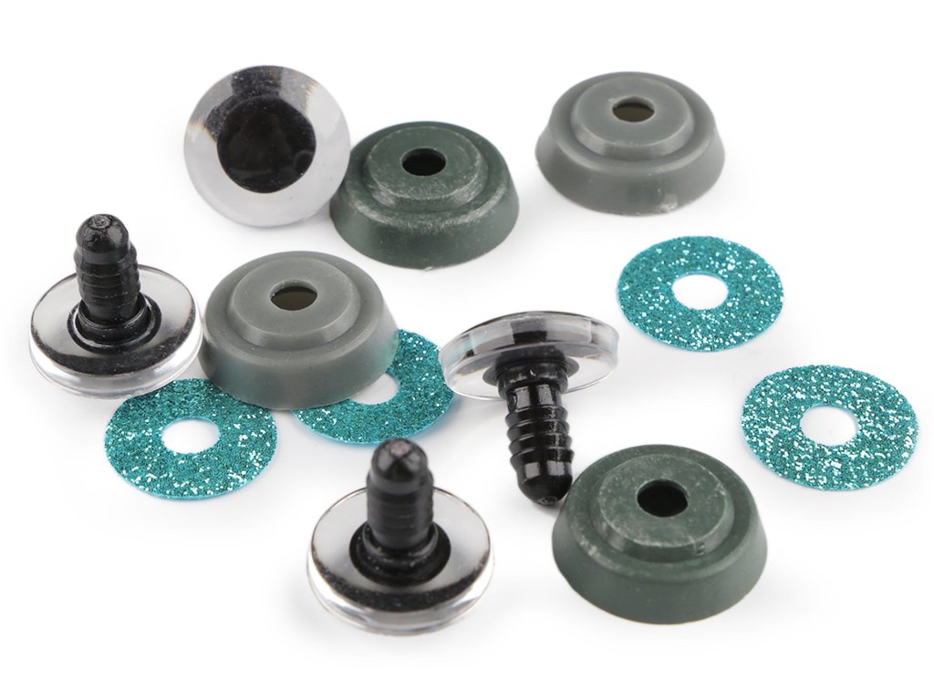 Polokulaté oči se třpytivou duhovkou umocní výraz vašich nejrůznějších postaviček či zvířátek. Mají závit, na který se nasadí duhovka, následně se provleče materiálem, a z druhé strany se pak nacvakne pojistka, která oči bezpečně připevní na místo. Kvůli větší bezpečnosti pojistek je zapotřebí vyvinout větší tlak při nasazování, jsou velice těsné. Pokud nebudete chtít, aby se oči třpytily, nemusíte duhovku použít, v tom případě zůstane duhovka transparentní.
