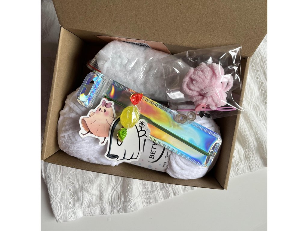 Háčkovací box obsahuje vše potřebné k uháčkování ducha. Součástí balení je také QR kód s odkazem na online videonávod.