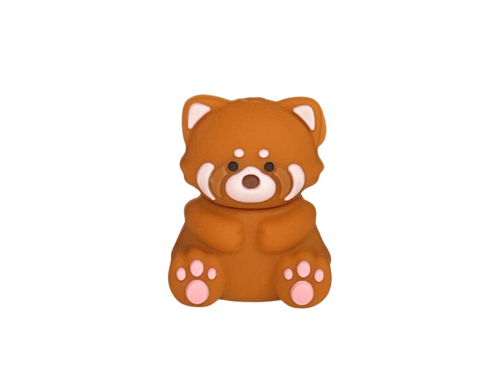 Silikonový korálek ve vzhledu pandy červené o rozměrech 2,5 x 1,9 cm.