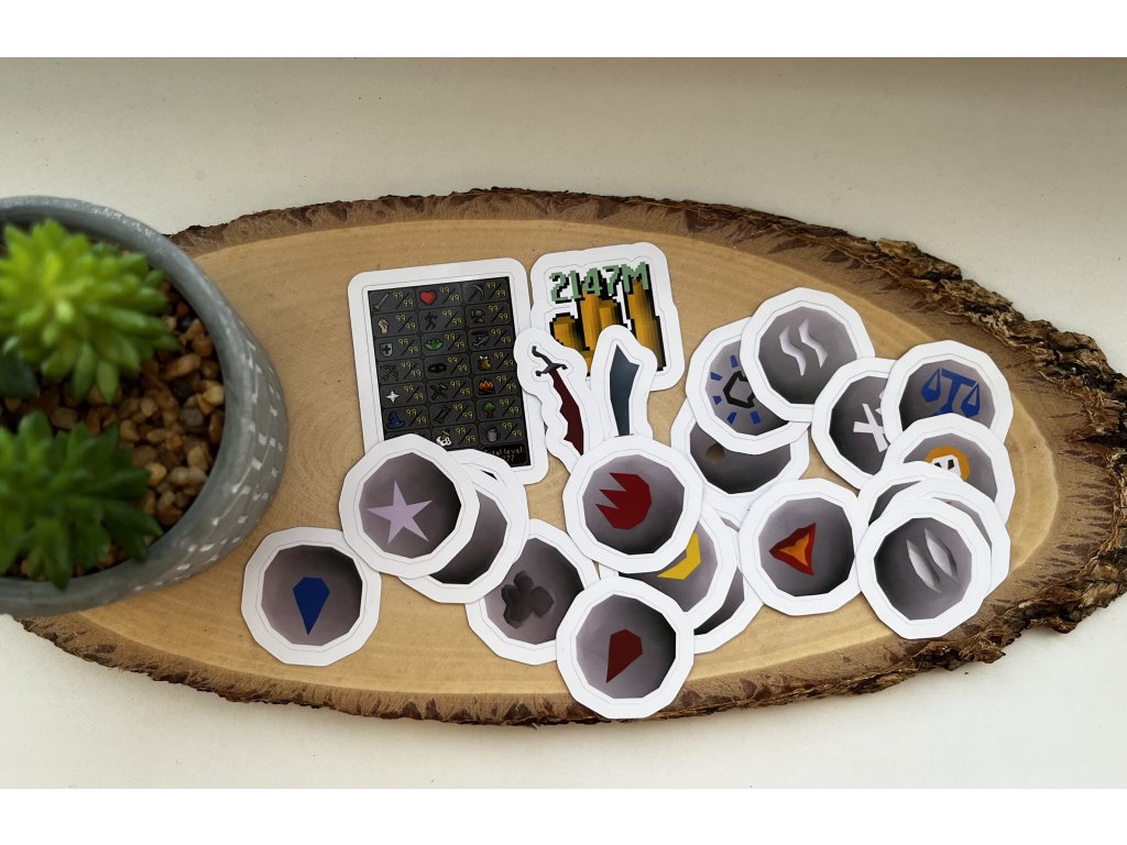 Set samolepek run ze hry Runescape, jako bonus i Rune Scimitar, Dragon Scimitar, max. gp a max. stats. Celkem 24 kusů samolepek s motivem Runescape.